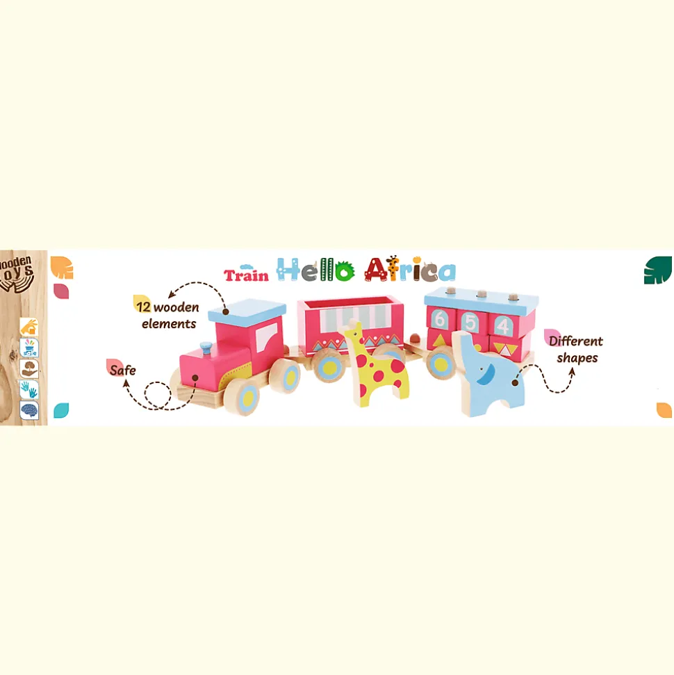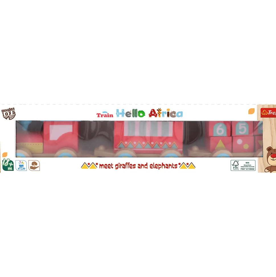 Produkt składa się z 3 wagoników, które można od siebie odłączyć, a także 2 figurek zwierząt. Train Africa wzmacnia odruch chwytania i rozwija koordynację wzrokowo-ruchową u dziecka. Uczy też kształtów, kolorów oraz nazw zwierząt. Wszystkie materiały, z których została wykonana zabawka, posiadają atesty oraz zostały pomalowane nietoksycznymi farbami.