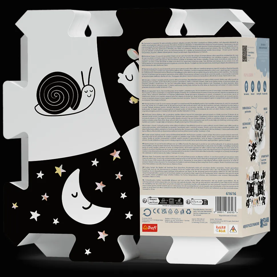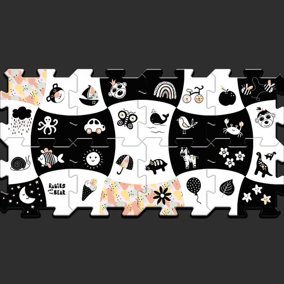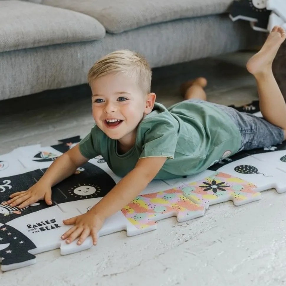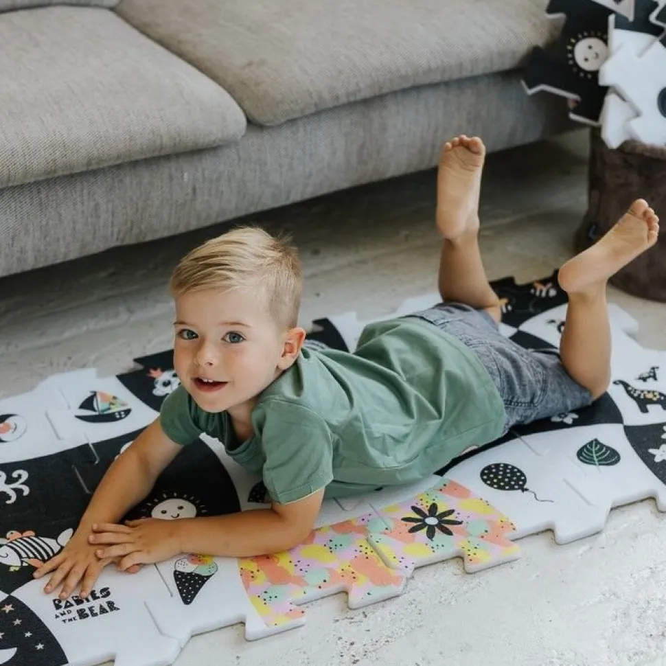 Układanka puzzlopianka Bobaski i Miś – kontrastowa to zestaw dużych i miękkich puzzli, stworzonych z myślą o małych fanach bajki Babies and the Bear.