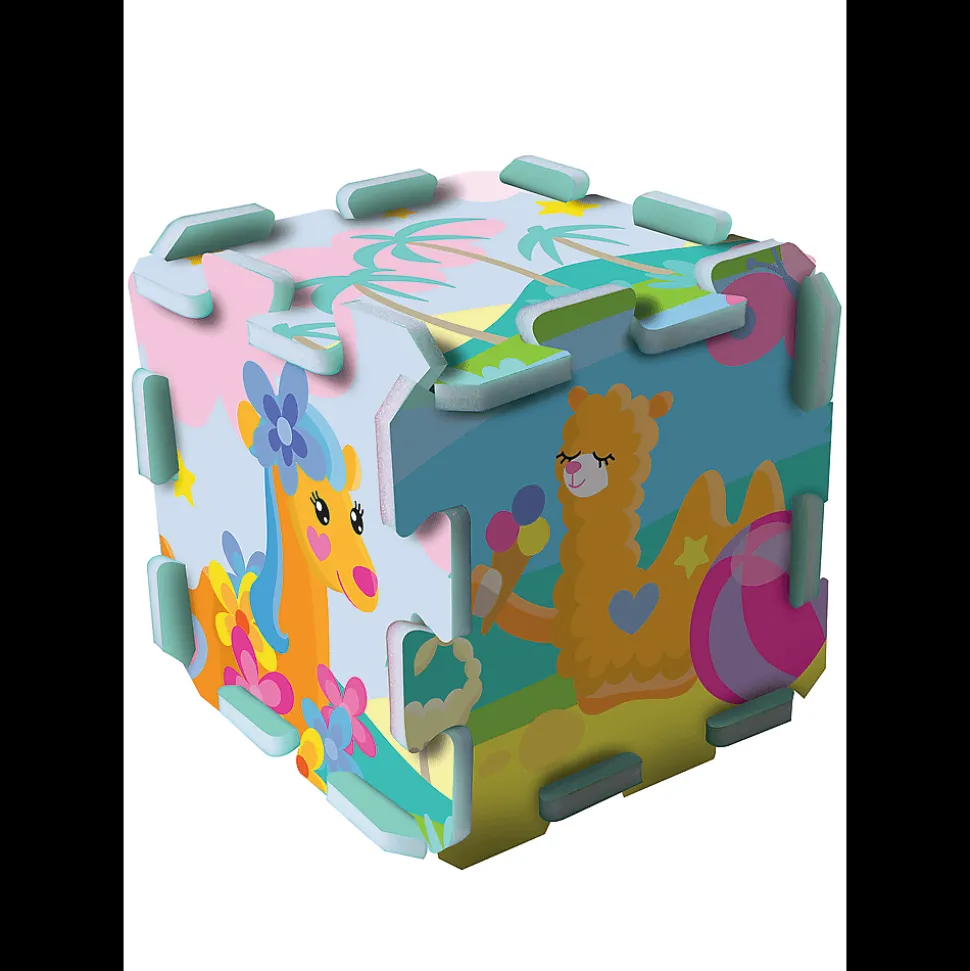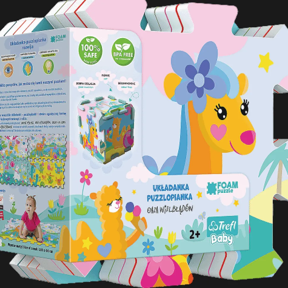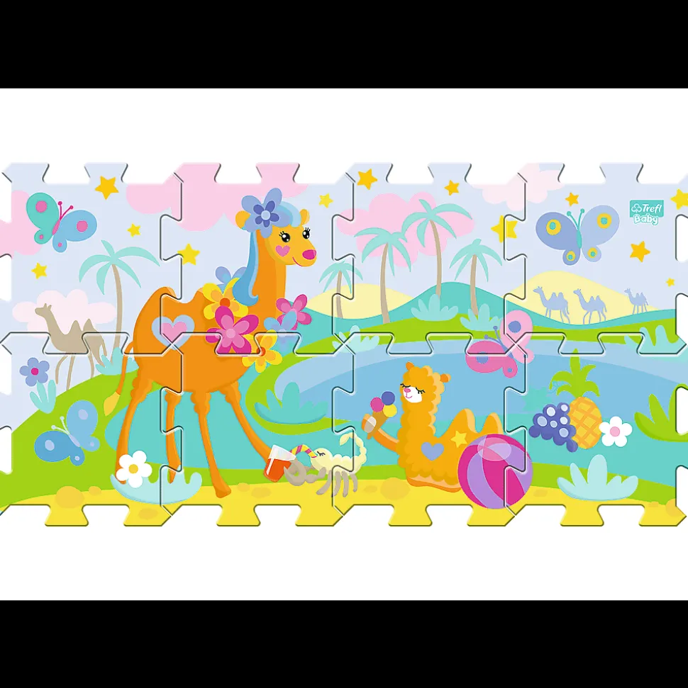 Układanka puzzlopianka Oaza wielbłądów to duże, miękkie, kolorowe puzzle, z których można budować figury przestrzenne, np. kostkę lub pudełko. Mogą również posłużyć jako podkładka przy innych zabawach. Układanka uczy spostrzegawczości, rozpoznawania kolorów i kształtów, budowania figur przestrzennych. Puzzlopianki można łatwo myć