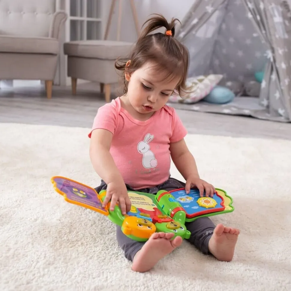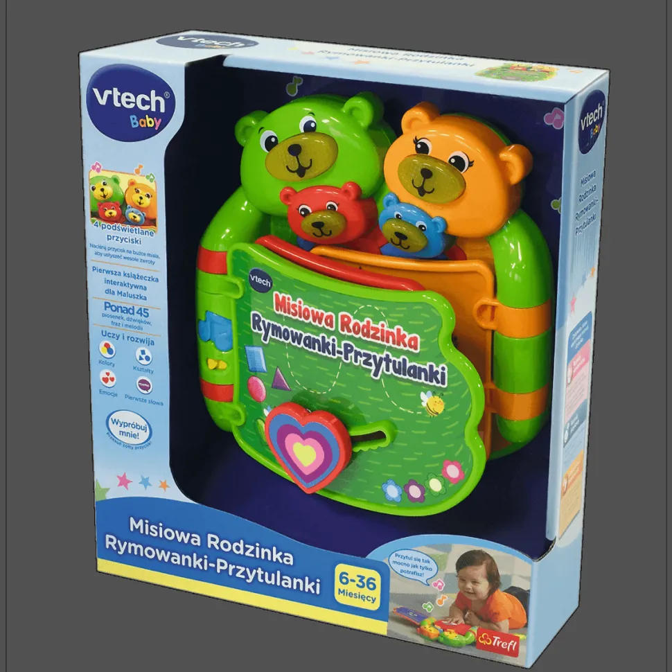Urocza książeczka opowiadająca o relacjach Misiowej Rodziny. W książeczce znajdziemy 6 starannie zaprojektowanych, interaktywnych, kolorowych stron opowiadających historię Misiowej Rodziny. Na każdej ze stron znajduje się ciekawa historia o każdym członku rodziny 6 kolorowych przycisków uruchamia urocze zwroty i piosenki. Przycisk Melodii uczy kształtów, liczenia oraz kolorów. Na brzuszku Misiowego Brata znajduje się przycisk chichotania, wystarczy przesunąć przycisk w górę i w dół, aby posłuchać wesołego chichotu 4 urocze przyciski w postaci buziek Misiów – każda buźka Misiowej Rodziny jest podświetlana oraz wygrywa słodkie rymowanki.