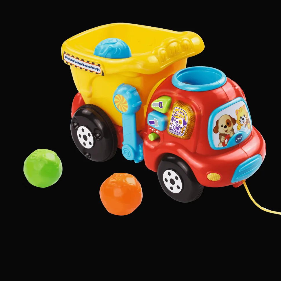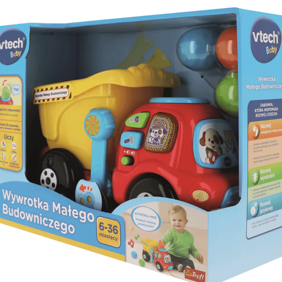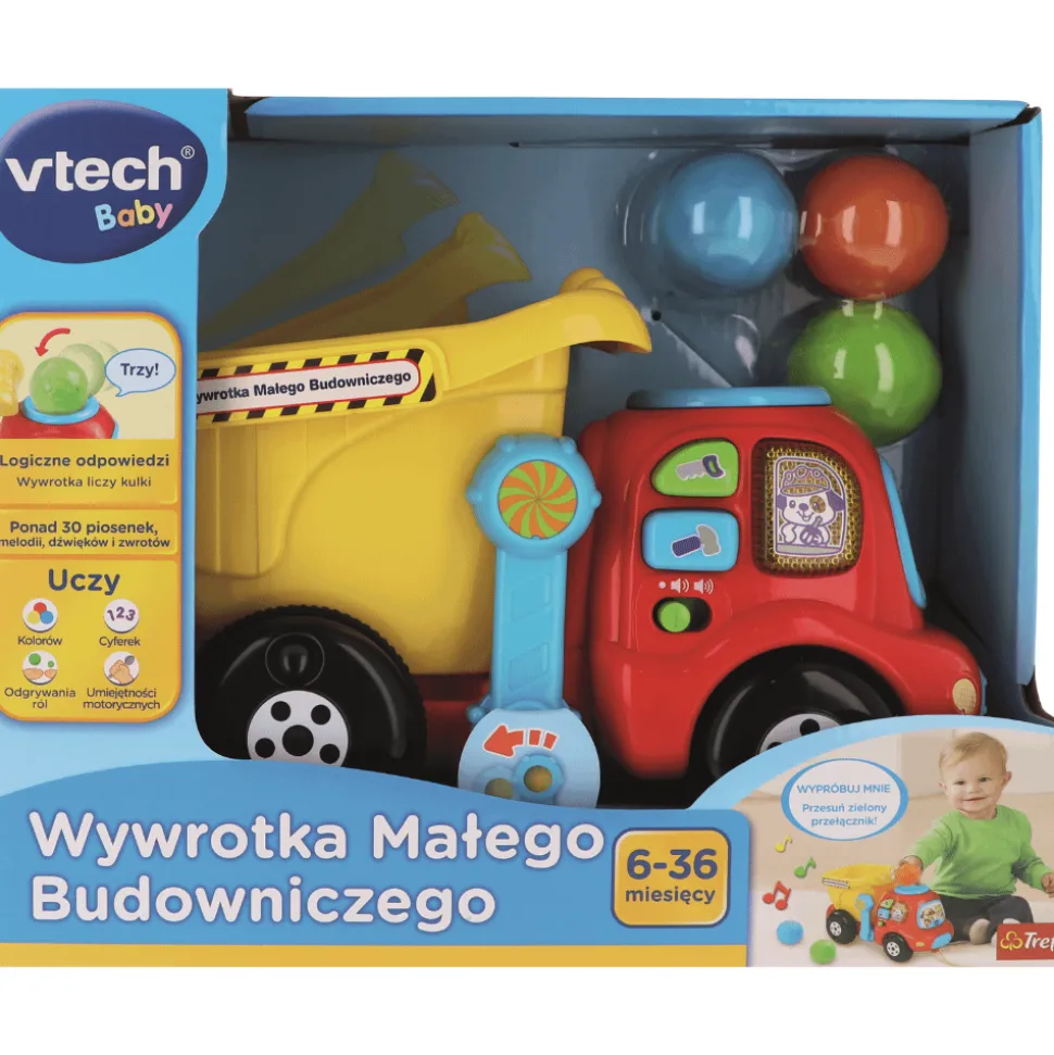 Wywrotka Małego Budowniczego marki VTech jest wielofunkcyjną zabawką edukacyjną dla dzieci, która rozwija umiejętność liczenia, a także motorykę. Wrzuć kolorową kulkę do specjalnego otworu na wywrotce, aby usłyszeć nazwy cyfr oraz naciśnij duże kolorowe przyciski, aby poznać kolory i nazwy narzędzi. Rozładuj wywrotkę i rozpocznij zabawę od nowa!
