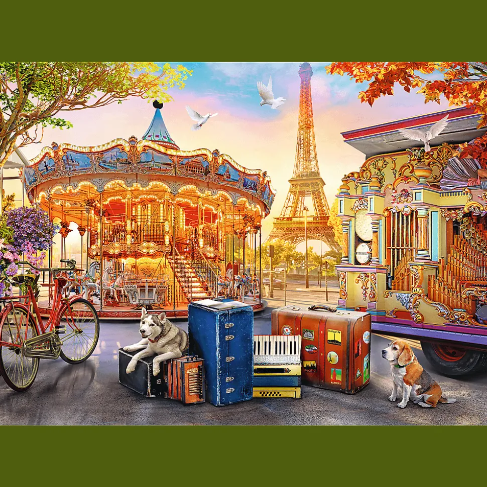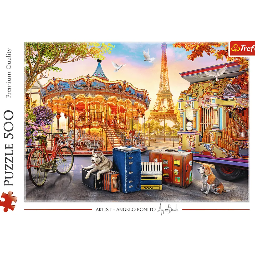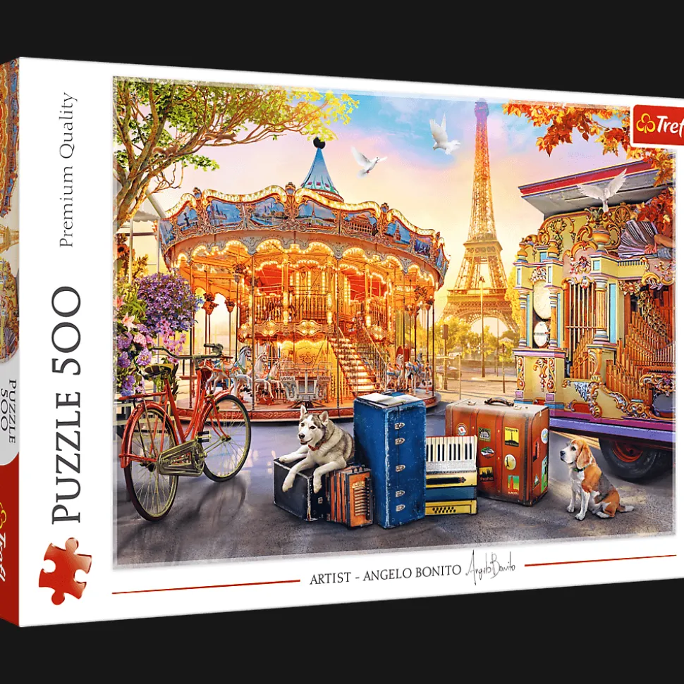 Puzzle składające się z 500 elementów przedstawiają urywek z wakacji w Paryżu. Po ułożeniu powstanie obrazek o wymiarach 580 x 340 mm.