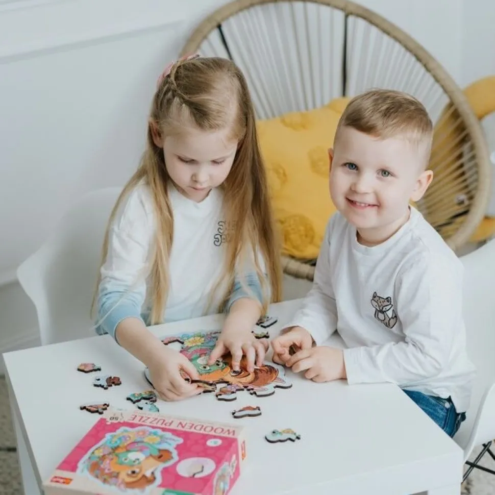 WOODEN PUZZLE 50 elementów to niezwykłe kształtowe układanki z naturalnego drewna, stworzone z myślą o maluchach.