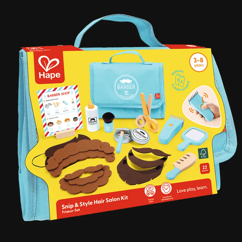 Realistyczne akcesoria, takie jak maszynka z efektem wibracji, filcowe dodatki do stylizacji oraz narzędzia fryzjerskie wykonane z bezpiecznych materiałów. Całość zapakowana w poręczną torbę, która pozwala zabrać zestaw wszędzie.