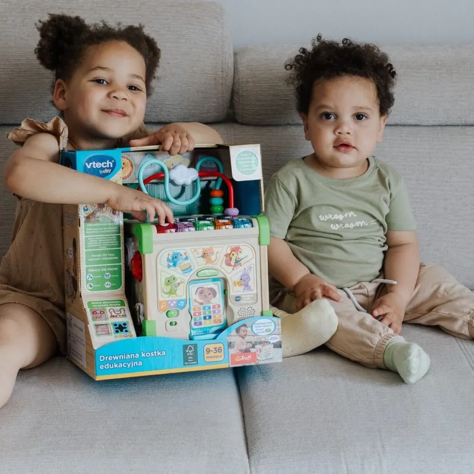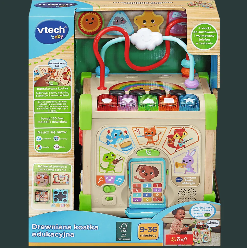 Drewniana kostka edukacyjna od VTech to doskonała zabawka interaktywna dla dzieci od 9 miesiąca życia, która wspiera rozwój motoryczny, sensoryczny i językowy maluchów. Dzięki wielofunkcyjnym elementom, takim jak świecące pianinko, sorter kształtów, labirynt z koralikami i wyjmowany telefon, dziecko uczy się kolorów, kształtów, nazw zwierząt i instrumentów muzycznych w angażujący i bezpieczny sposób.