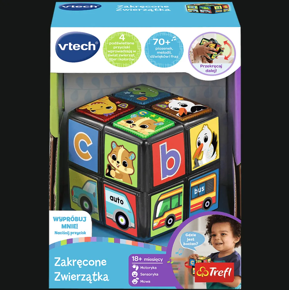 Zakręcone Zwierzątka od VTech to edukacyjna zabawka w formie kostki, którą można przekręcać. 2 warianty zabawy i 4 podświetlane przyciski wprowadzą malucha w świat zwierząt, liter, kolorów. Wystarczy, że dziecko przekręci kostkę w lewo lub w prawo, a usłyszy zabawne zwroty zachęcające do nauki i interakcji. Zabawka uczy nowych słów, wspomaga rozwój sensoryczny i ćwiczy umiejętności motoryczne.
