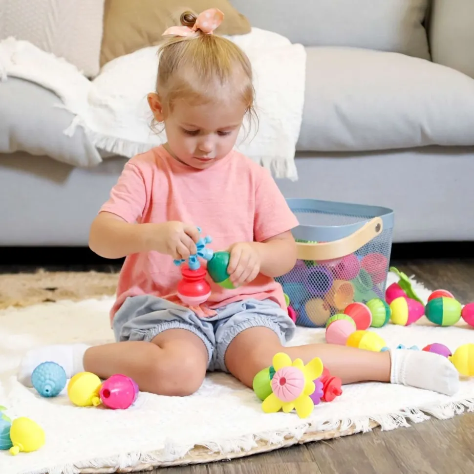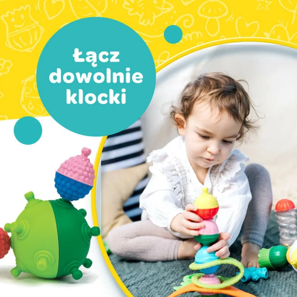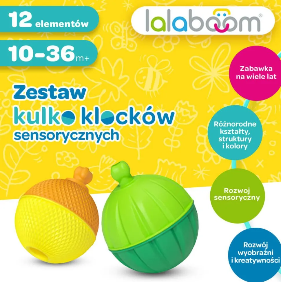 Zestaw 12 – elementowych kulko – klocków Lalaboom dostarcza wiele zróżnicowanych wrażeń dotykowych ze względu na różne faktury poszczególnych elementów. Zabawka daje możliwość ćwiczenia ruchów obrotowych nadgarstka. Zestaw Lalaboom wspiera ćwiczenie koordynacji wzrokowo – ruchowej dziecka.