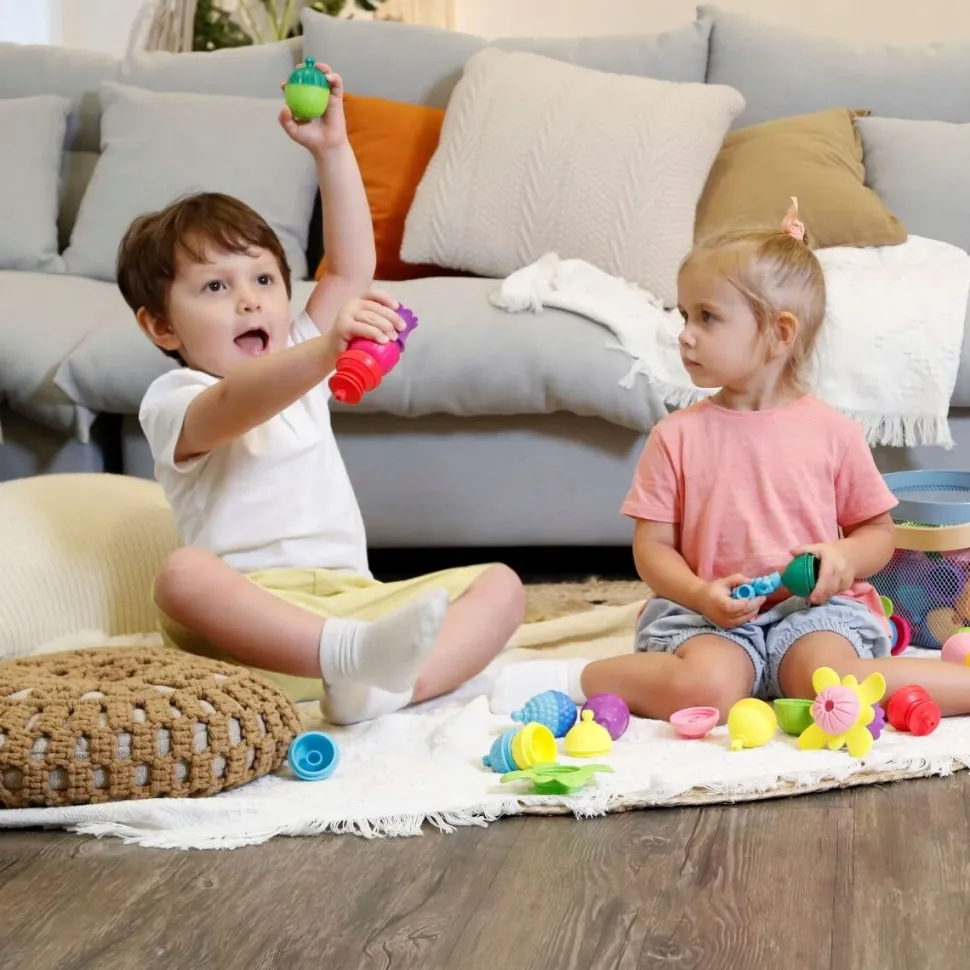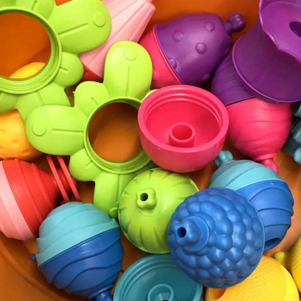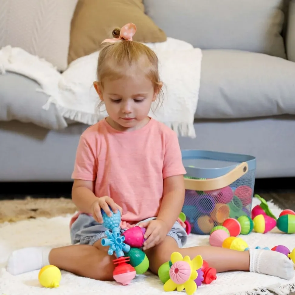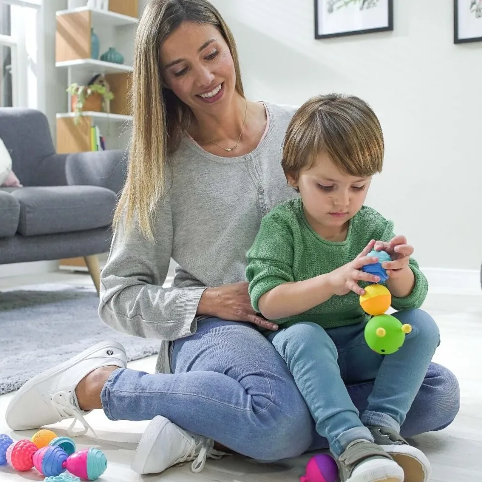 24 elementowy zestaw kulko – klocków Lalaboom dostarcza wiele zróżnicowanych wrażeń dotykowych ze względu na różne faktury poszczególnych elementów. Zabawka daje możliwość ćwiczenia ruchów obrotowych nadgarstka, rozwija chwyt pęsetkowy (przeciwstawienie kciuka palcowi wskazującemu) i precyzyjne ruchy ręki przy nawlekaniu (rozwija małą motorykę i koordynację wzrokowo-ruchową). Zabawka wspiera ponadto ćwiczenie koordynacji wzrokowo-ruchowej.