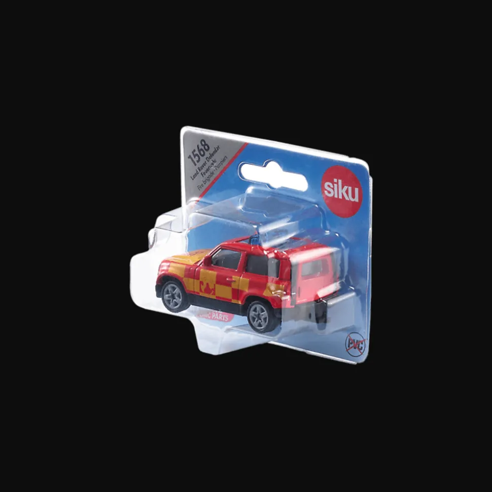 Duży, szklany szyberdach zapewnia dobrą widoczność wnętrza pojazdu, które również w małej skali jest wierne oryginałowi i zostało wykonane z wytrzymałego tworzywa sztucznego. Model pojazdu marki Siku jest w kolorze charakterystycznej czerwieni strażackiej z żółtymi akcentami oraz niebieską belką sygnalizacyjną. Przednie i tylne światła są nadrukowane zgodnie z oryginałem. Land Rover Defender jest wyposażony w srebrne felgi oraz zintegrowany sprzęg przyczepowy, dzięki czemu można go łączyć z różnymi modelami przyczep Siku.