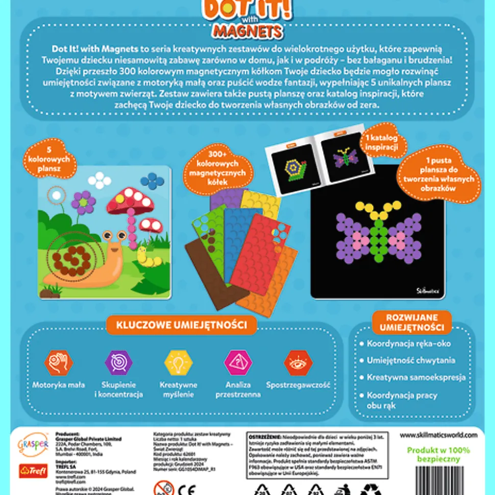 Dot it! With Magnets Świat Zwierząt to zestaw kreatywny z magnesami wielokrotnego użytku. Zabawa bez bałaganu i brudzenia: w domu i w podróży. Puść wodze fantazji i stwórz niezwykłe obrazy przy użyciu ponad 300 magnetycznych kółek.