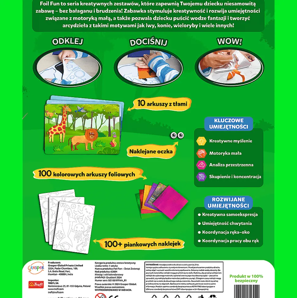 Foil Fun Świat Zwierząt to zestaw kreatywny do tworzenia magicznych dzieł sztuki. Kolorowe tła, folie i piankowe naklejki w przeróżnych kształtach, pozwolą dziecku wykreować własny świat pełen zwierząt. Zestaw pobudza kreatywność dziecka i wspiera rozwój motoryki małej. Wystarczy puścić wodzę fantazji i oddać się twórczej ekspresji — a wszystko to bez bałaganu!
