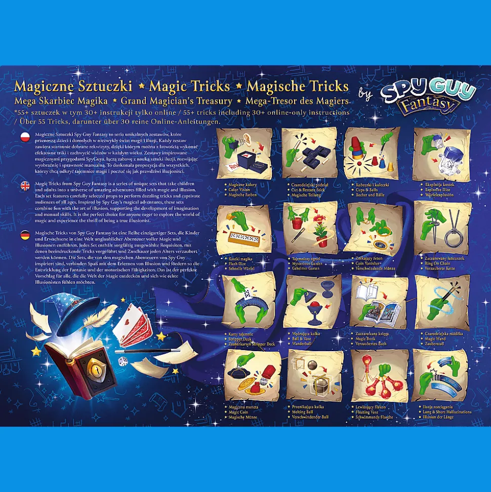Eleganckie pudełko z okienkiem kryje prawdziwe skarby iluzjonisty, a dołączone filmy instruktażowe online sprawią, że nauka sztuczek będzie łatwa i przyjemna. Seria Magiczne Sztuczki od Spy Guy Fantasy to kreatywna zabawa dla dzieci i dorosłych, którzy chcą poczuć się jak prawdziwi magicy!