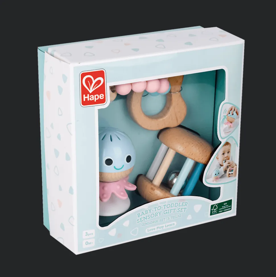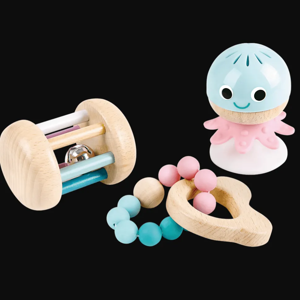 Zestaw sensoryczny dla niemowlaka składający się z 3 elementów to gryzak stworzony specjalnie dla małych rączek, grzechotka do przymocowania na przyssawkę i grzechotka do turlania. Te zabawki wspomagają rozwój dziecka na różnych etapach: Grzechotka z przyssawką może towarzyszyć podczas pierwszych posiłków, gryzak stanowi idealnego towarzysza podczas ząbkowania, natomiast turlająca się grzechotka doskonale sprawdzi się podczas okresu raczkowania.